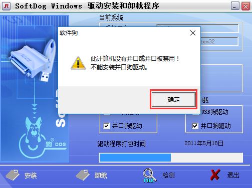 • 若弹出”此计算机没有并口或并口被禁用,不能安装并口狗驱动”,无需理会,点击确定后驱动会正常安装